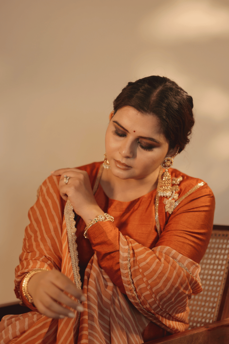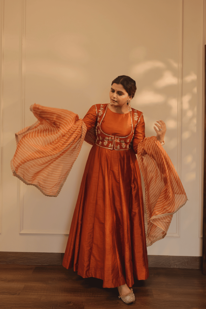 Seen Here Is Our Narangi Pure Raw Silk Anarkali Kurti Paired With Palazzo. It Comes With Intricate Zari And Dabka Hand Embriodery On The Jacket/Koti And Pure Organza Laherya Dupatta With Kiran Work On The Edgings.